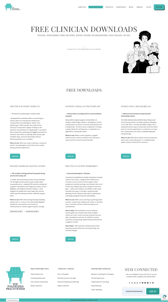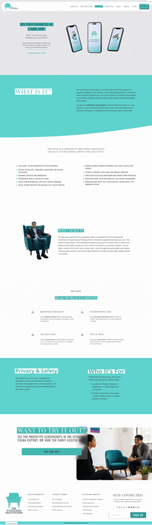 My main challenge was organizing a wide range of services—business coaching, clinical supervision, consulting, and patient resources—while ensuring accessibility and maintaining a strong brand identity. Through strategic navigation, custom graphics, and mobile-first layouts, I created a seamless user experience that highlights both the personal and political dimensions of the practice. The result: improved engagement, clearer resource discovery, and a site that truly reflects the founder’s mission and expertise.