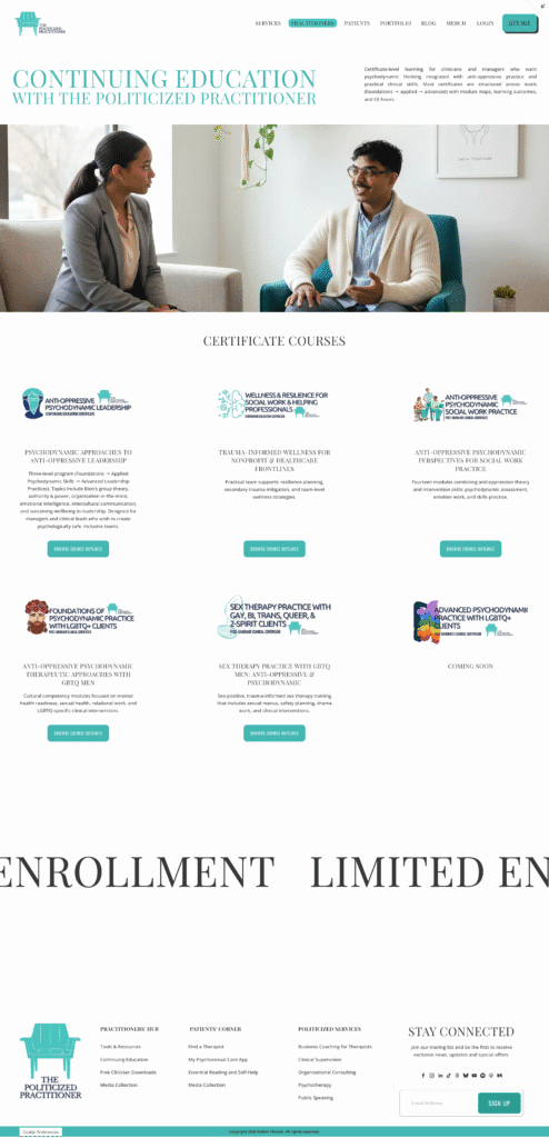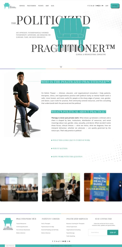 I had the opportunity to lead the Squarespace website design for The Politicized Practitioner, a platform dedicated to supporting clinicians, organizations, and patients with politically informed mental health resources. The project involved translating a complex, multi-audience vision into an intuitive, visually compelling site.