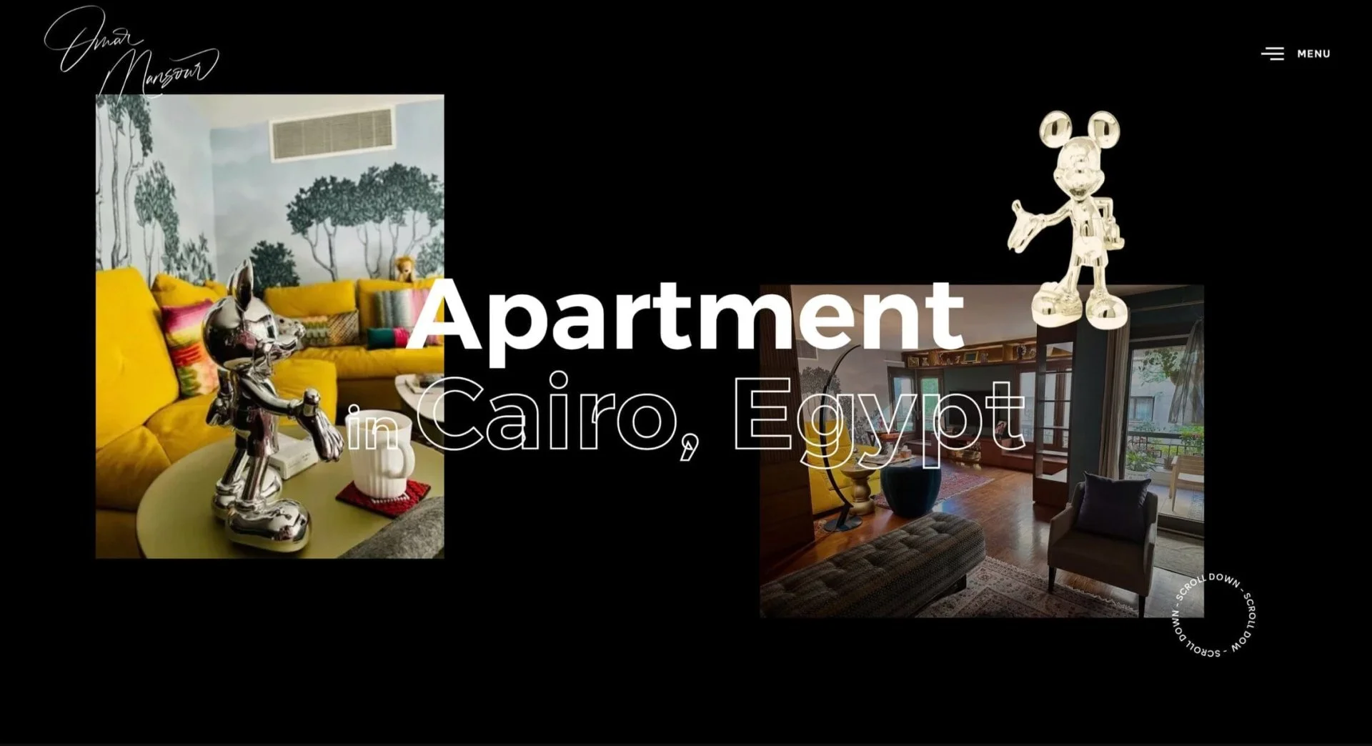 A portfolio-focused WordPress site with black canvas backgrounds that make Omar's colorful interiors pop like gallery art. Clean white line icons for services, overlapping image layouts on project pages, and his elegant script logo anchoring the brand.