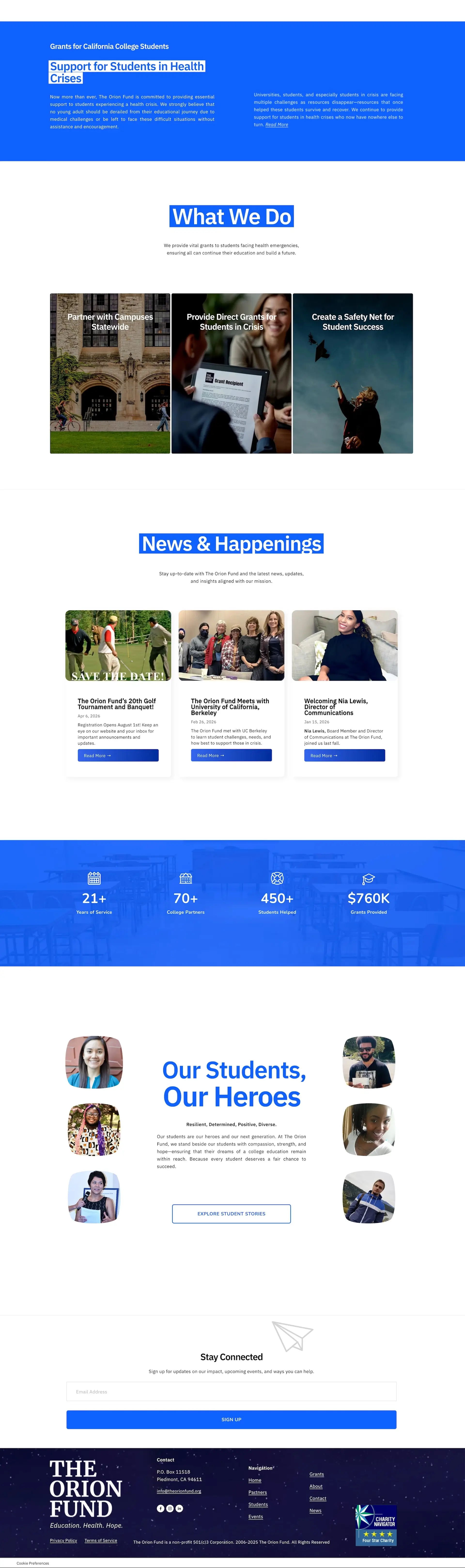 This nonprofit needed a site that could balance heart, clarity, and action. I reworked the experience to better explain the mission, highlight student impact, and create stronger donation and engagement pathways. The final site feels more credible, more human, and much easier for supporters to navigate and trust.