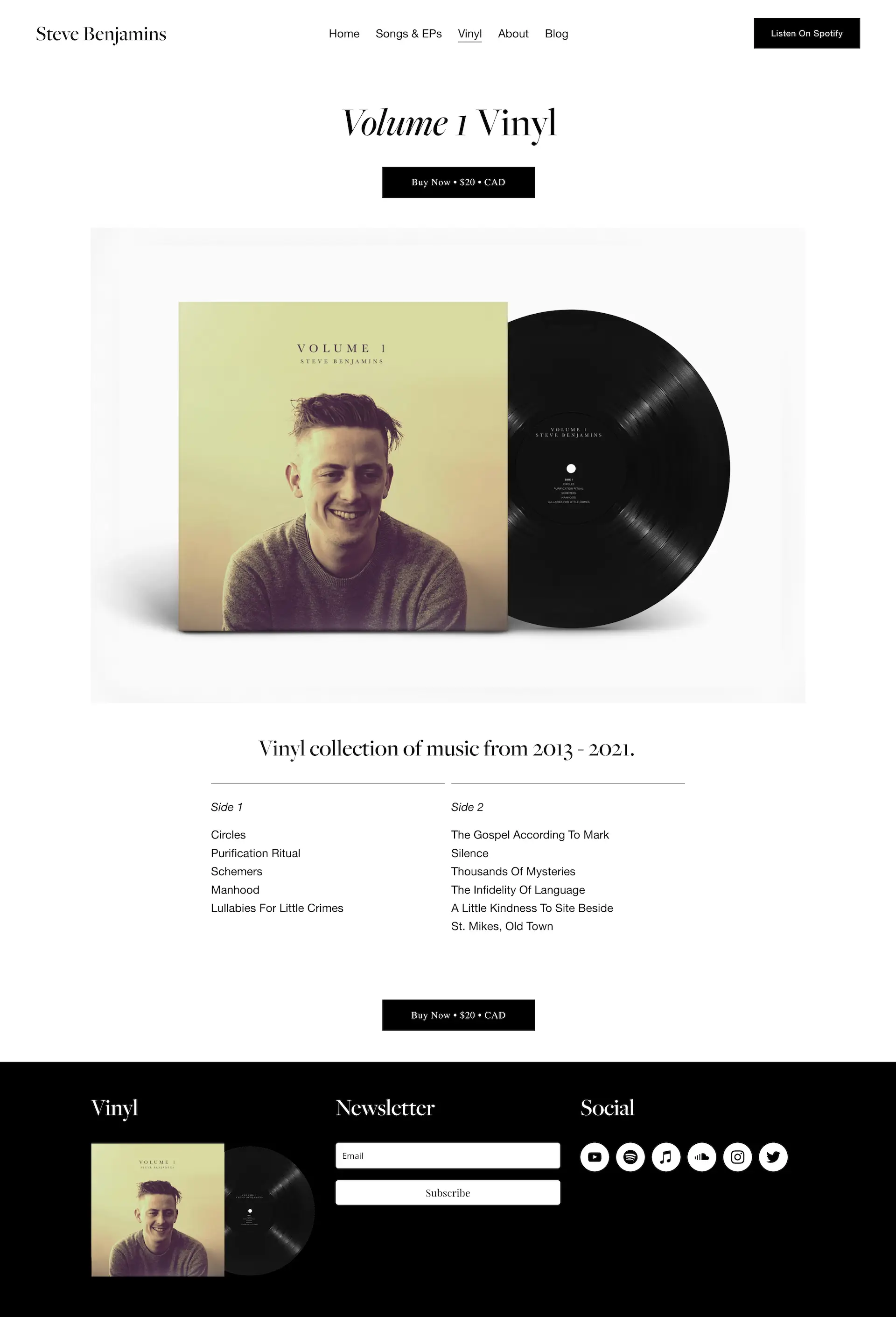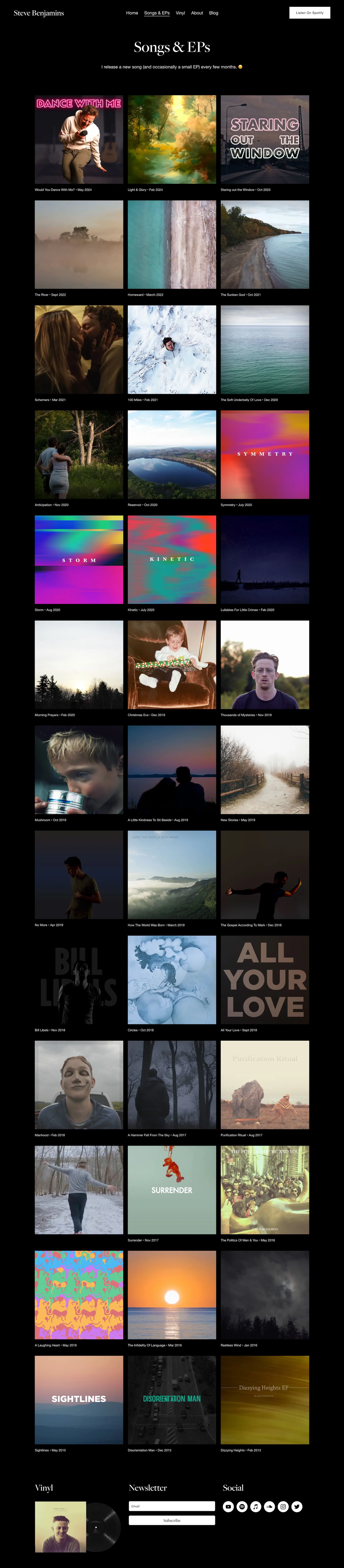 A musician Squarespace website design project built to promote new releases and drive both streaming and vinyl sales. The tricky part was unifying music, blog, and commerce under one roof without it feeling cluttered or pulling focus from the music itself. I designed a cohesive structure that keeps the latest release front and center, with intuitive paths to the store, blog, and streaming platforms. Every page reinforces the artist's identity, and the commerce integration feels native — not bolted on. It's a site that works as hard as the music does.